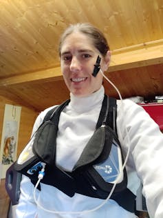 But wearing a face mask under the fencing mask reduced my oxygen level to around 17% – the equivalent of exercising at 1,500m. Any further decreases in oxygen concentration – by exercising longer or harder – would have a large effect on the physiological responses to exercise, causing altitude-sickness symptoms such as dizziness or headache.